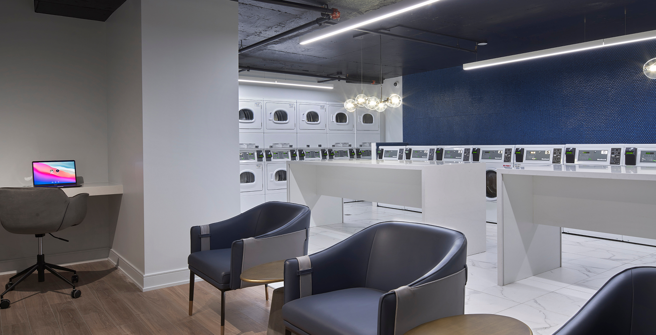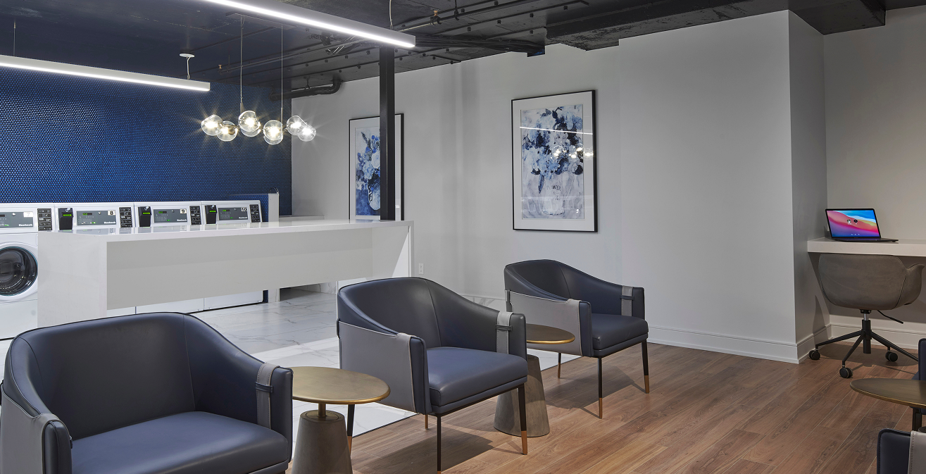 A luxurious, renovated laundry pavilion featuring brand-new equipment and an adjacent lounge/co-working area. Secure, brand-new storage locker rooms are also available for residents.