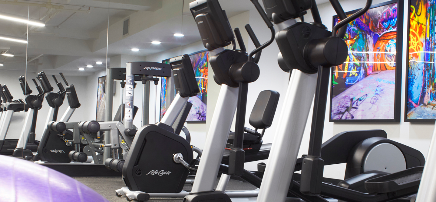 A state-of-the-art wellness center featuring first-class cardio and strength training equipment, including a Hydrow rowing machine, Lululemon Mirror for guided yoga and stretching, an Echelon training bike with instructor-led classes, and a full Life Fitness resistance circuit. The studio also includes a dedicated kettlebell and TRX suspension training zone.