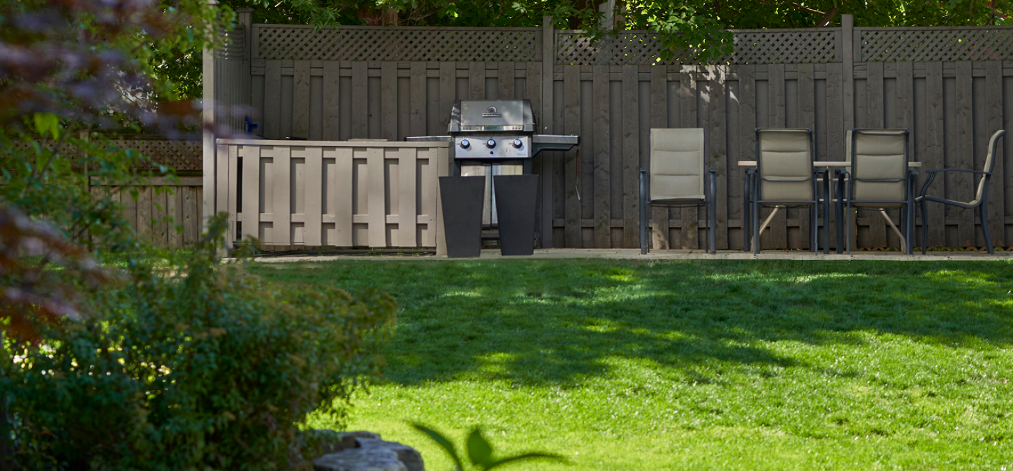A dedicated outdoor barbecue and dining area, perfect for entertaining guests in a lush garden setting.