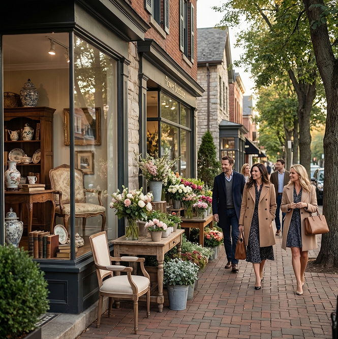 Explore the unique storefronts along Mount Pleasant Road, including Bernardi’s Antiques and Tuula Flowers.